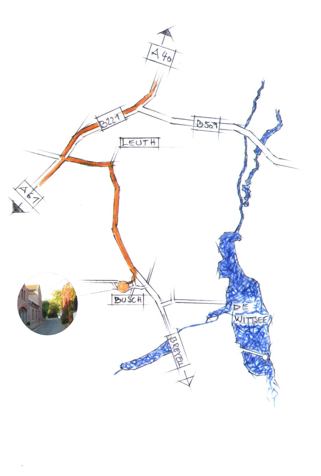 A 40 in Richtung Venlo, Abfahrt Straelen/Herongen, Nettetal (letzte Abfahrt vor der Grenze, NL), links Richtung Nettetal auf die B221, ca. 7 km geradeaus an der 3. Ampel links in den Ort Leuth bis zur T-Kreuzung an der Kirche, dort rechts Richtung Breyell, ca. 1 km aus dem Ort heraus, grünes Ortsschild "Busch", dort rechts, nächste wieder rechts, links auf den Parkplatz "Busch8"